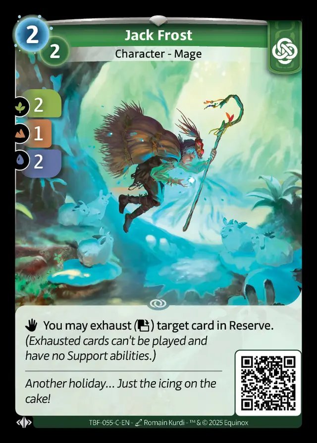 An allegory for winter in English-speaking cultures, Jack Frost is said to be the man behind the changing color of autumn leaves, frost on the grass, and fingers and toes nipped by the cold. He is often represented as an elf with white hair, blue eyes and clothes covered in frost. He's a mischievous character with a childlike nature. Those who make him angry may even find themselves frozen in place. The powers attributed to Jack Frost include creating ice, bitter cold winds, and wintry precipitation like snow and freezing rain.