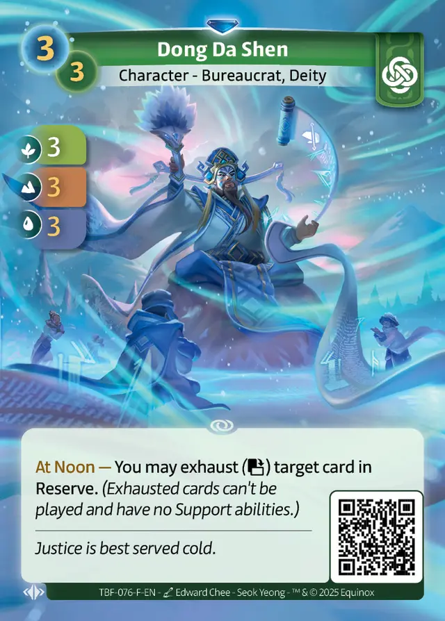 Up ahead, the blizzard intensifies. That certainly won't help our cause. Unless… The Heka lights up my hands as I trace the necessary symbols in the wind. Carried by the swirling gusts, a gigantic paper scroll unfurls in a circle before us. At its center, Dong Da Shen lounges on a lump of snow, a magnificent blue cape whipping in the wind at his back. I hope that his presence will bring fear to our enemies while easing our own. Ideograms written on the scroll blaze with an azure flame. I remember that the document Dong Da Shen holds is a statement of criminal charges. His inquisitorial voice thunders as he points his scepter at the wintry mob. He's the perfect choice here as he is the god of cold, and his painted mask is the face of winter. Yielding to his authority, the Belisenki disperse and return to the shelter of the trees. I'll be feeling all manner of aches, pains and sore joints before long, but considering the alternative, that's really not so bad.