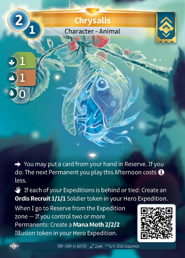 When I go to Reserve from the Expedition zone — If you control two or more Permanents: Create a Mana Moth 2/2/2 Illusion token in your Hero Expedition.