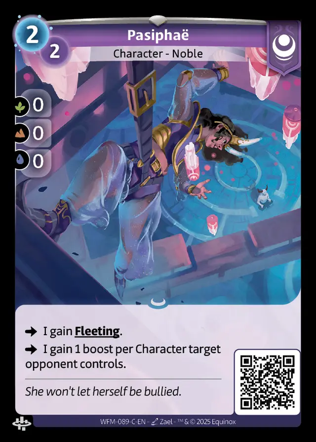 Pasiphaë is the daughter of Helios, god of the Sun, and Perse, one of the Oceanid nymphs. Her sister is Circe, and like her, she too is a talented sorceress. As the wife of Minos and witch-queen of Crete, she is a victim of her husband's pride when he disobeys Poseidon's commands. She is cursed to fall in love with the white bull that was to serve as an offering to the god of the sea, and through this love she becomes the mother of the Minotaur.