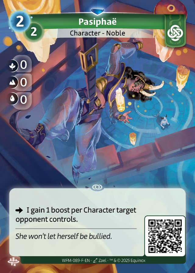 Pasiphaë is the daughter of Helios, god of the Sun, and Perse, one of the Oceanid nymphs. Her sister is Circe, and like her, she too is a talented sorceress. As the wife of Minos and witch-queen of Crete, she is a victim of her husband's pride when he disobeys Poseidon's commands. She is cursed to fall in love with the white bull that was to serve as an offering to the god of the sea, and through this love she becomes the mother of the Minotaur.