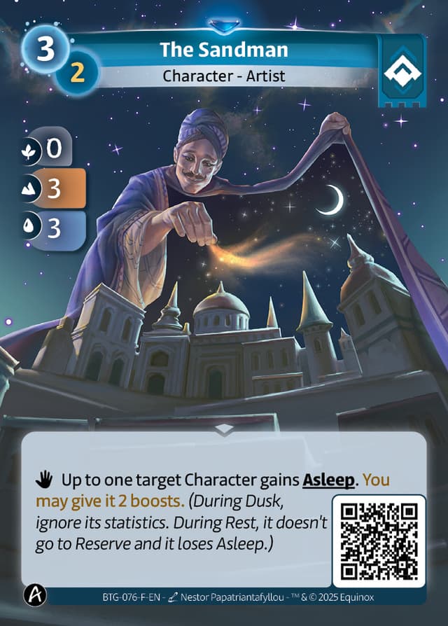 Up to one target Character gains Asleep. (During Dusk, ignore its statistics. During Rest, it doesn't go to Reserve and it loses Asleep.)