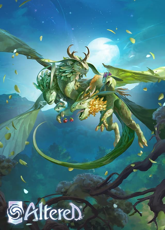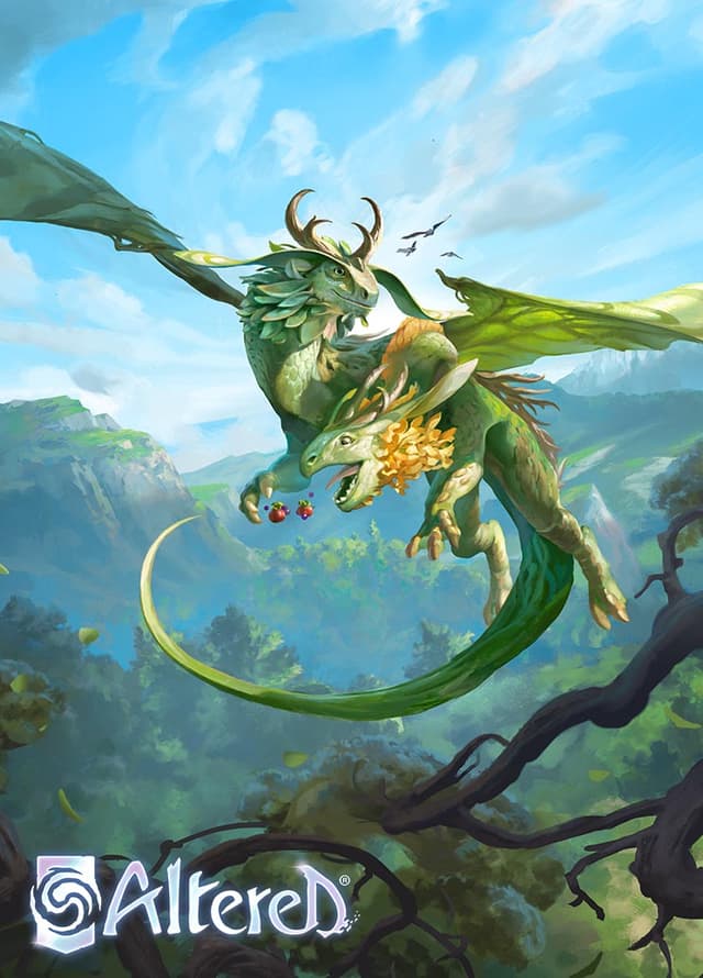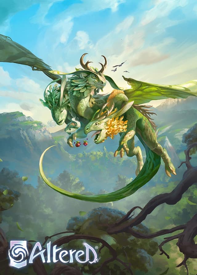 Okay, let's go. I take a swig of water and haul my gear onto my back again. Maybe it's time to visit a human enclave to stock up? Though deep in thought, I still remember to leave a piece of biscuit for the little Chimaera that must still be following me. But just as I'm about to leave, a shadow falls from the sky. The creature perches on the rock I just left, spreading its plant wings. My eyes go wide as I recognize a dracaena, its size so imposing that merely batting its wings makes my legs wobble. It has grown so much that it now has multiple heads... all of them are turned toward me, and looking a tad hungry. I know I have nothing to fear, as they're far more partial to fruit than to meat. It must have gotten a whiff of my last apple. Well... life on the road is certainly full of surprises...