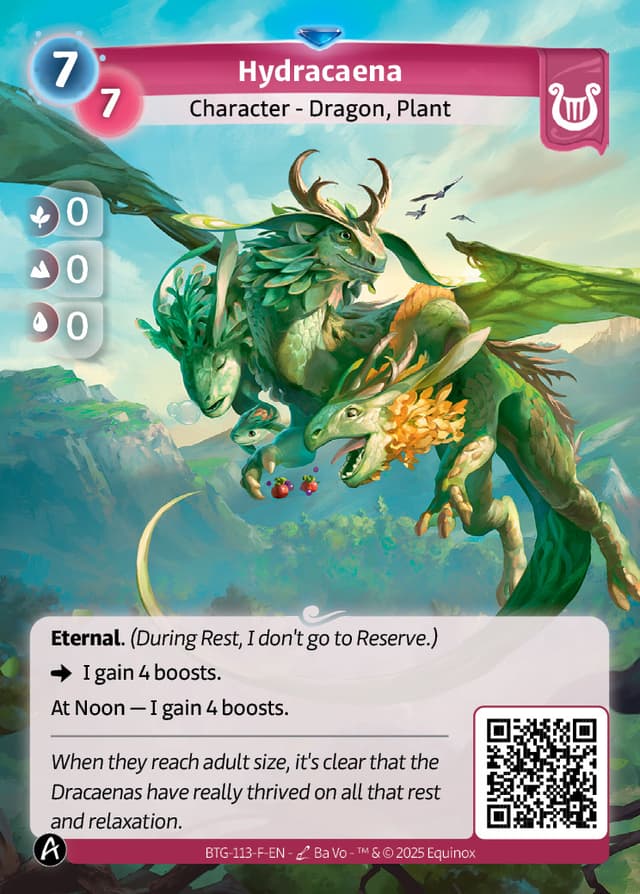 Okay, let's go. I take a swig of water and haul my gear onto my back again. Maybe it's time to visit a human enclave to stock up? Though deep in thought, I still remember to leave a piece of biscuit for the little Chimaera that must still be following me. But just as I'm about to leave, a shadow falls from the sky. The creature perches on the rock I just left, spreading its plant wings. My eyes go wide as I recognize a dracaena, its size so imposing that merely batting its wings makes my legs wobble. It has grown so much that it now has multiple heads... all of them are turned toward me, and looking a tad hungry. I know I have nothing to fear, as they're far more partial to fruit than to meat. It must have gotten a whiff of my last apple. Well... life on the road is certainly full of surprises...