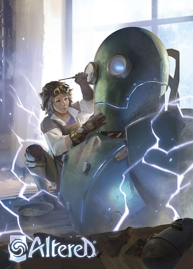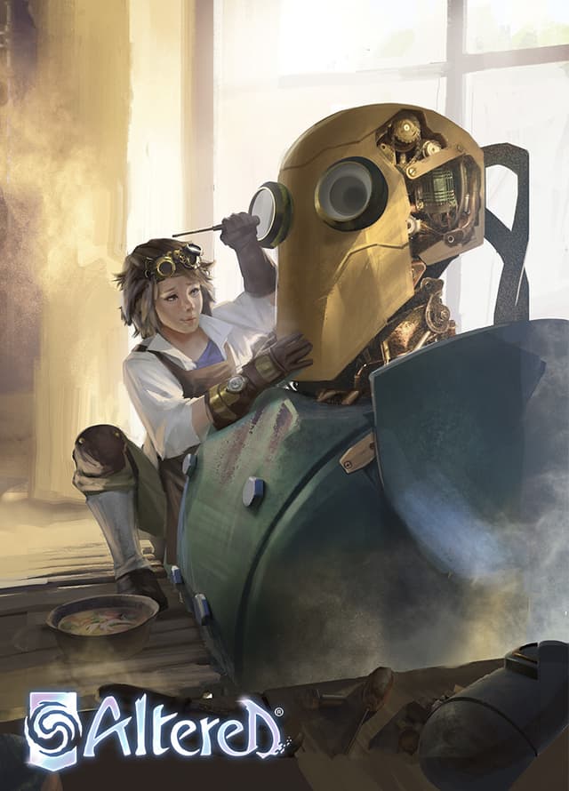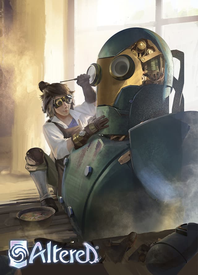 I wipe my forehead as I finally release the hydraulic cylinders of my press. The stifling heat of the workshop would leave anyone parched. I grab my canteen and take a few swigs of tepid water to quench my thirst. Near Oddball's charging station, Aberdeen is working hard, her face dripping with sweat. She skillfully tightens the bolts of the last prototype… or what's left of it after last week's explosive disaster. Even though she's young – maybe even younger than I was when I first came to the Foundry – Aby puts in lots of hours without complaining. And judging by my Apprentice's smile when she works, she clearly loves what she does. I can't wait to see her face when she finds out she'll become a Journeyman in a few months, and that this workshop will be hers.