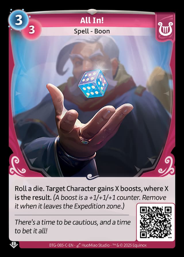 Roll a die. Target Character gains X boosts, where X is the result.(A boost is a +1/+1/+1 counter. Remove it when it leaves the Expedition zone.)