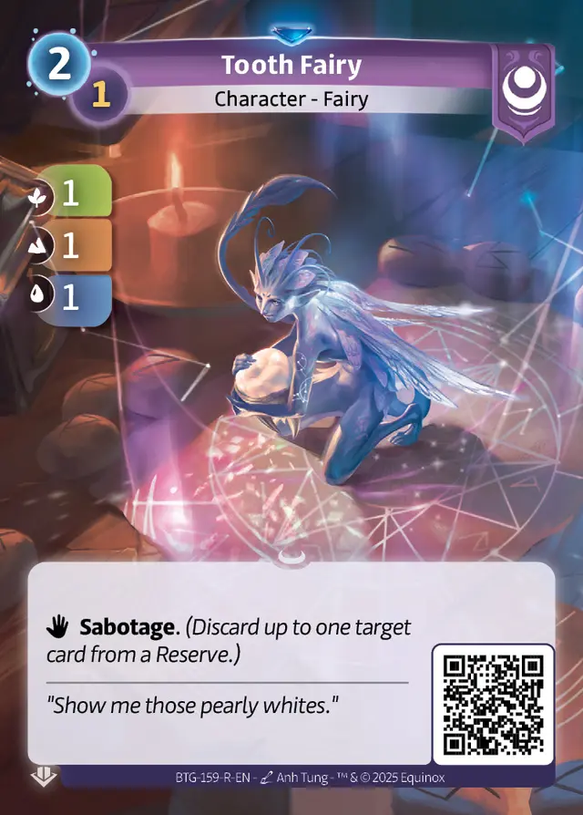 With a trembling hand, I place the tooth on the summoning circle. There's trouble brewing, and I need to suppress it before the situation worsens. In the crucible of my mind, erratic and absurd ideas are already forming. I mustn't let them escape into the world. If I lose control, they could be very damaging for me and my peers. I exhale and grit my teeth, fighting against the fever and the madness. I'll have to carry out the tand-fe quickly if I want to avoid spiraling into insanity. Come, Tooth Fairy. Come, so we can move on with the deal... She suddenly appears. Her wings buzz as she lands and her scorpion tail flicks as she scans the surroundings. Then she notices the tooth and grabs it, showing her fangs to show that it now belongs to her.