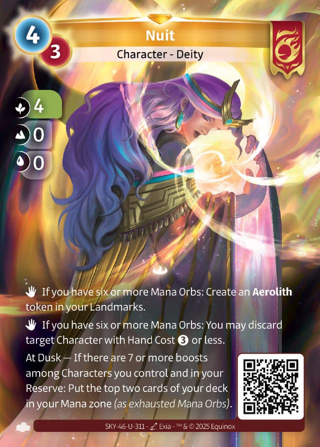 At Dusk — If there are 7 or more boosts among Characters you control and in your Reserve: Put the top two cards of your deck in your Mana zone (as exhausted Mana Orbs).