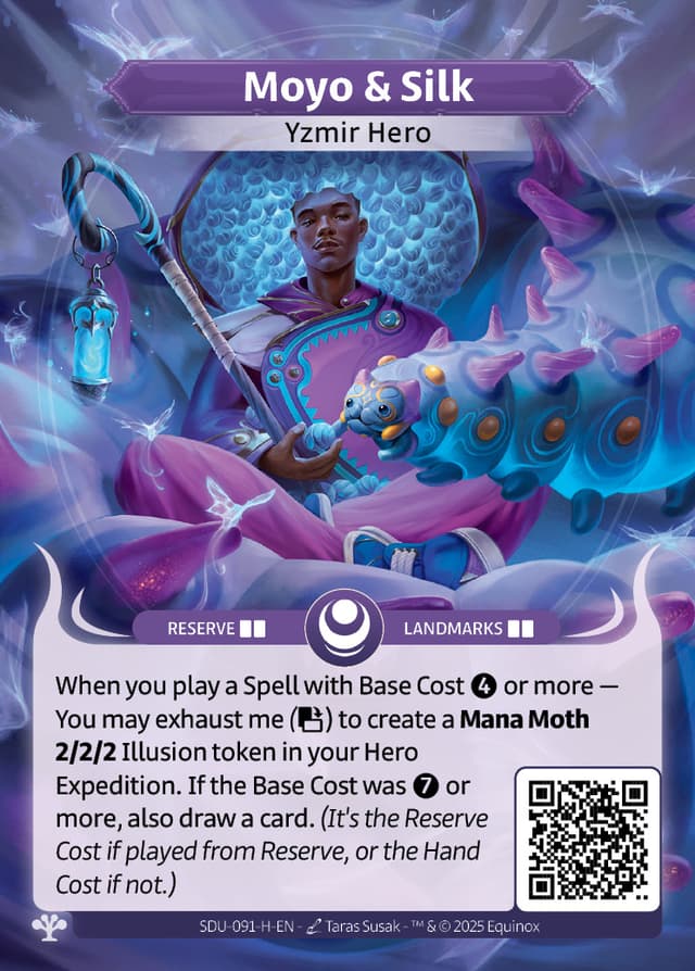 When you play a Spell with Base Cost or more — You may exhaust me () to create a Mana Moth 2/2/2 Illusion token in your Hero Expedition. If the Base Cost was or more, also draw a card.(It's the Reserve Cost if played from Reserve, or the Hand Cost if not.)