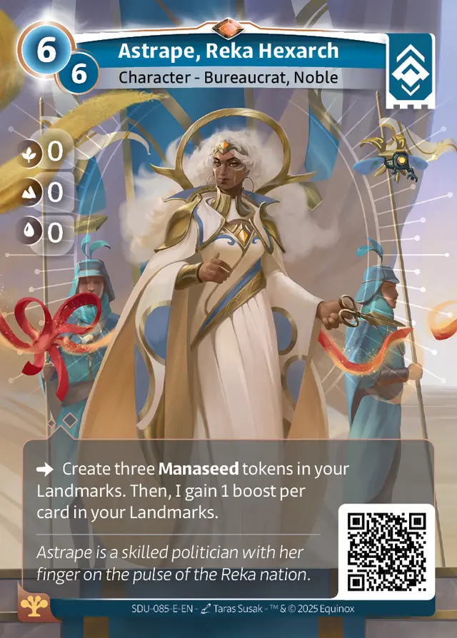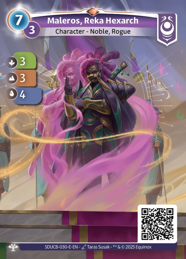 The Hexarchs are at the heart of this new set, both in terms of gameplay—since they are the 6 Exalted cards—and on a story level, where they are the focus of all political discussions and negotiations. Find the Hexarchs in their Emissary illustration: an exceptional juxtaposed mural of 6 cards, depicting them in their ceremonial attire.
