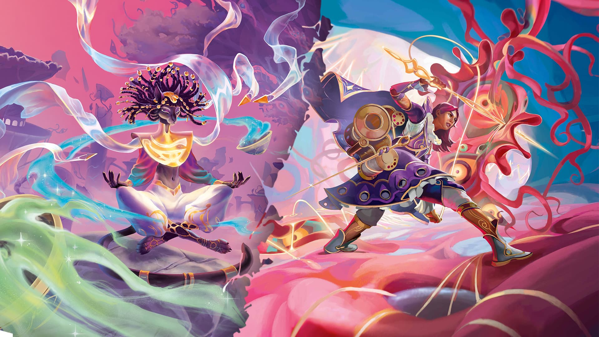 In this Altered expansion, the virtuoso Lyra handle incense sticks with the same grace as a harp or a paintbrush. By weaving smoke through every card's artwork, our creative team wanted to show a faction united in effort. While incense has replaced song and paint to banish the corruption, its universal symbolism of healing and spiritual cleansing makes it a powerful visual language for players to understand the battle for the city.