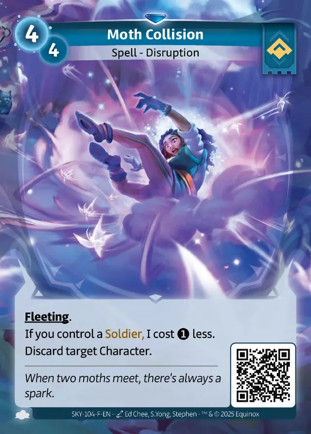 The text for Moth Collision in its Ordis Rare version was printed with the wrong reduction cost. The correct version of the card applies a mana cost reduction of {1} instead of {2}. The official text is as follows: