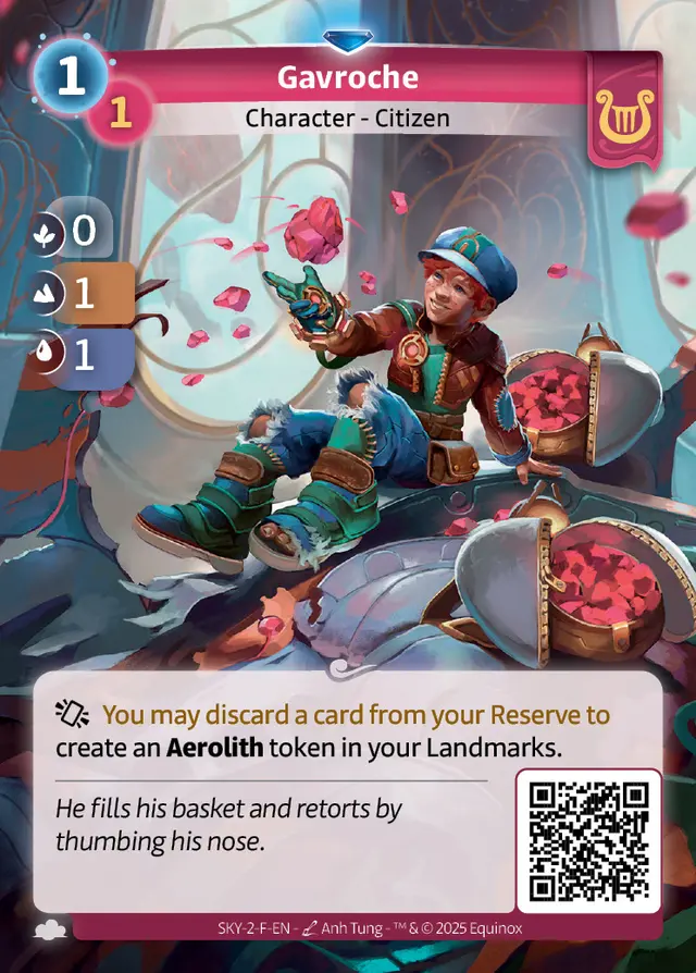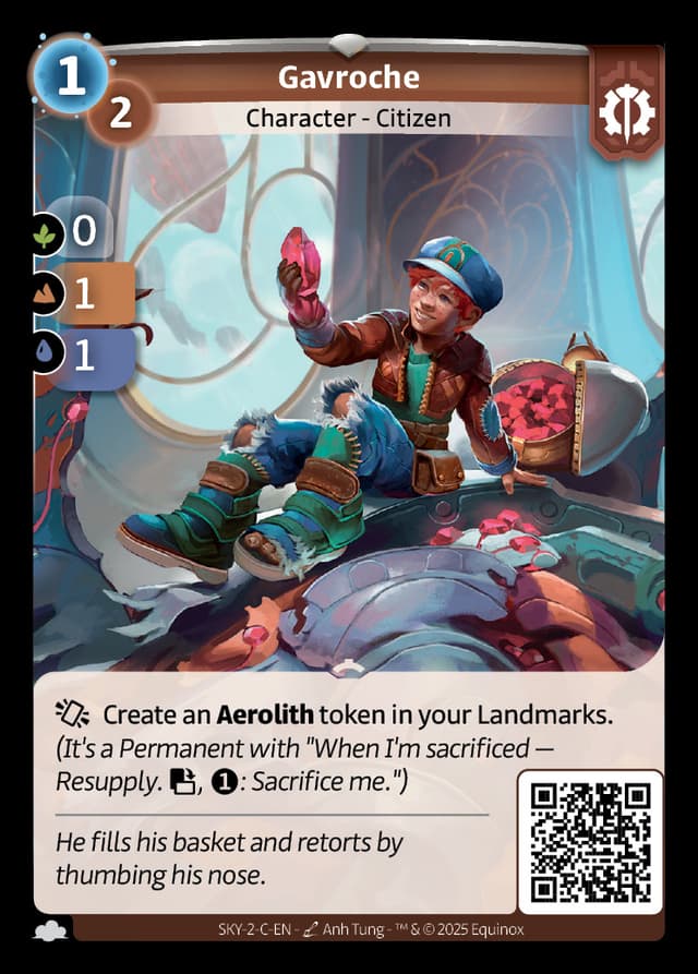 Gavroche is a simple and efficient source of Aerolith associated to a 1 mana Character, which is always powerful. At the very least, it allows you to resupply and delve deeper into your deck, but in a dedicated Isaree & Pebble deck, it becomes a very efficient card that can do so much more than its cost suggests.