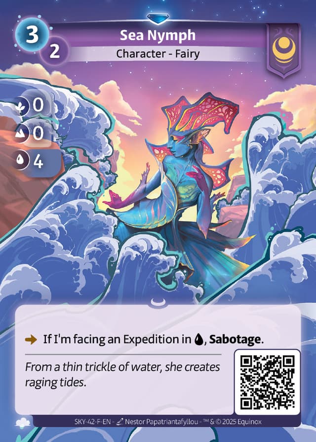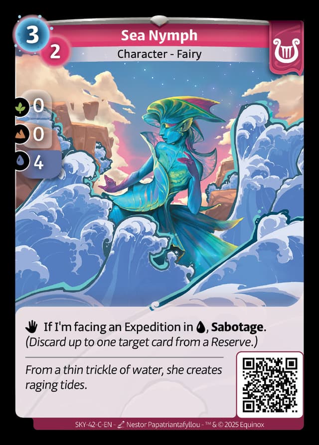 A common pattern in Altered is to overfocus on all the statistics needed to move forward, when you only need one. When creating Sea Nymph, we went back and forth between two patterns: focus on your own region (to match this first intuition) or the opposing Expedition’s (to guide new players towards a new way of thinking about the game). Since many Altered designs already encourage you to check your own Expedition, we decided to dig deeper into the design space that is unique to the set and to Nadir’s strategy.