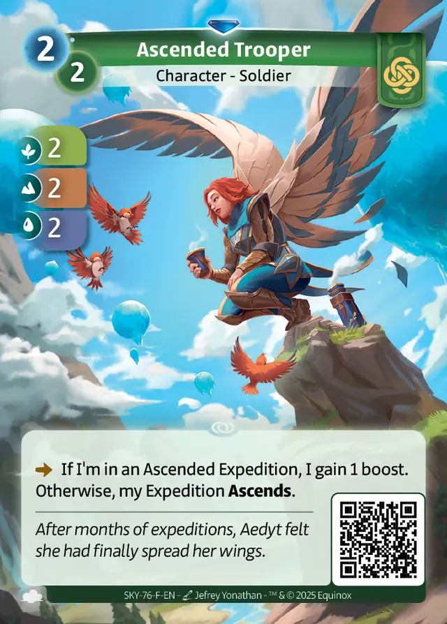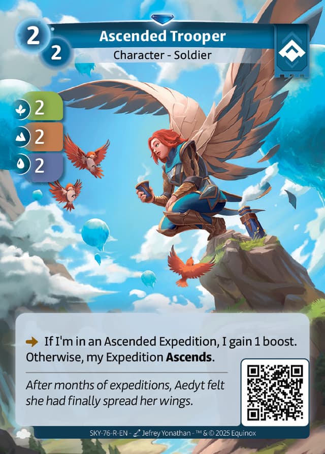 Ascend was designed as a top-down mechanic, to fit the theme of aerial exploration and flying islands. As with all strategies based on a mechanic, you require cards that make your expeditions ascend (enablers) and cards that reward you for doing so (payoffs). During early testing, most of the enablers worked well, but the payoffs were often unreliable outside a dedicated Zen & Zephyr Ascend deck. Cards like Ascend Trooper were designed as a solution to this issue: the card is simultaneously a payoff and an enabler, and Ascend helps you move forward in all kinds of Ordis strategies.