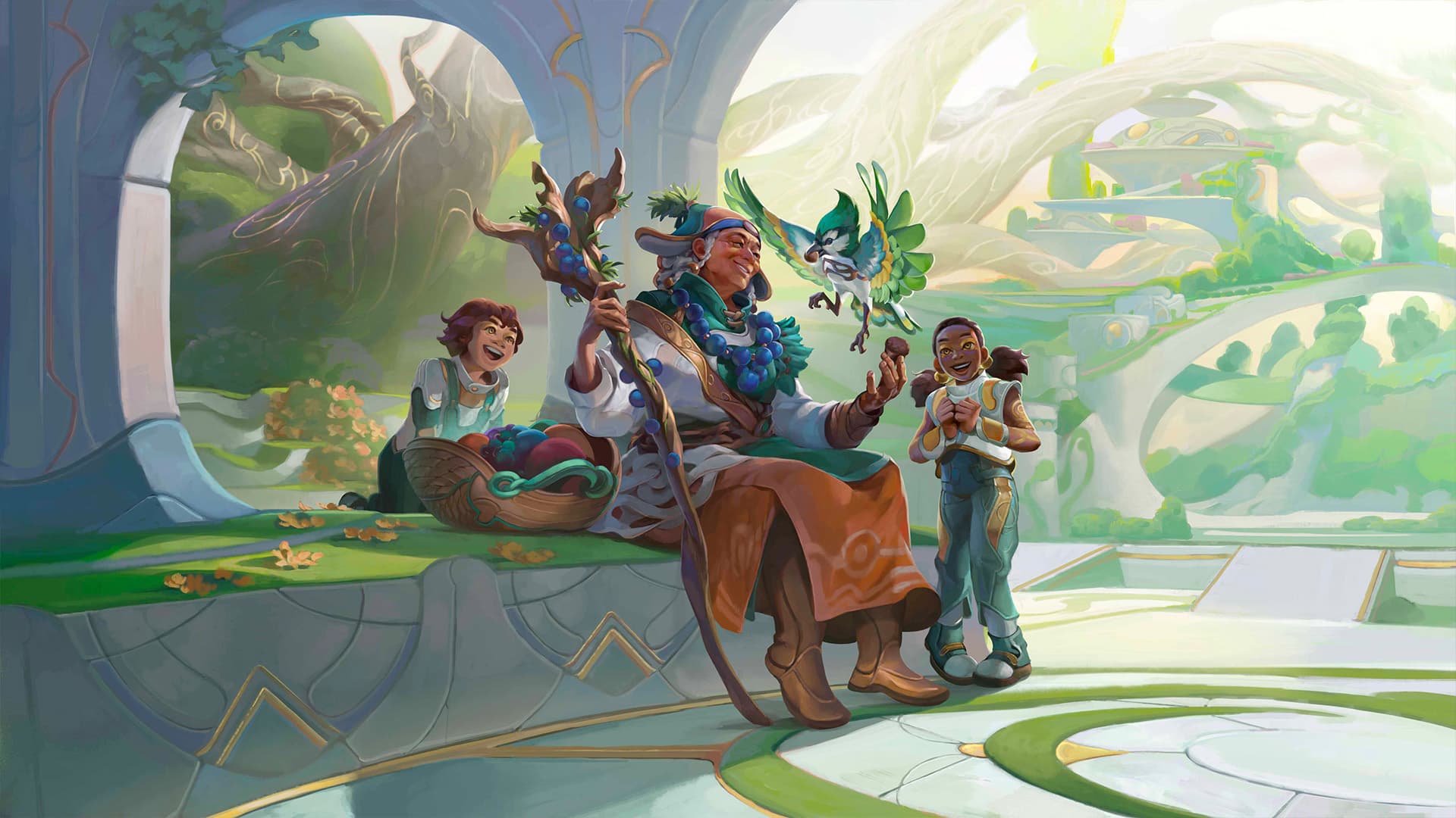 When Rin came to her, Turuun did not expect her life to change so completely. As a priestess, she had taught the young girl the way of the Muna, and later, when the girl and her Chimera became an Exalt, she guided the pair, helping them understand the nature of this new bond and soften the violence of that transition. After her protégé left, instead of returning to live in Amorgand, she chose to care for the new Exalts awakening month after month, as compatible Chimera were brought back from the edge of the Known World. She herself found a life companion in Benih, a mischievous Tumult entity that had taken the form of a green hill jay. But when the explicit request came to bring fruits and flowers from the Spindle to the Expeditionary Corps, Turuun volunteered for the journey — both to see her student again and to discover new horizons.