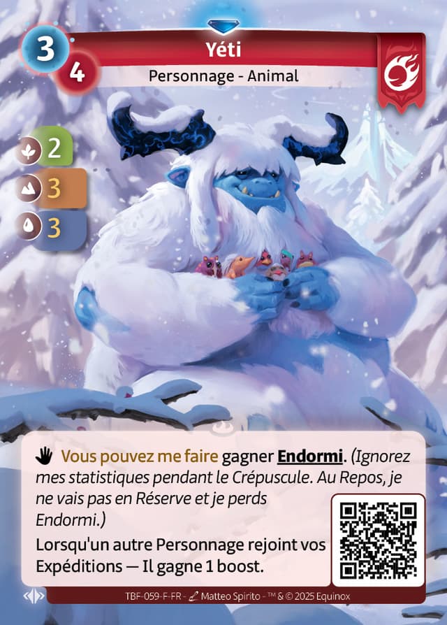 gagner Endormi.(Ignorez mes statistiques pendant le Crépuscule. Au Repos, je ne vais pas en Réserve et je perds Endormi.)Lorsqu'un autre Personnage rejoint vos Expéditions — Il gagne 1 boost.
