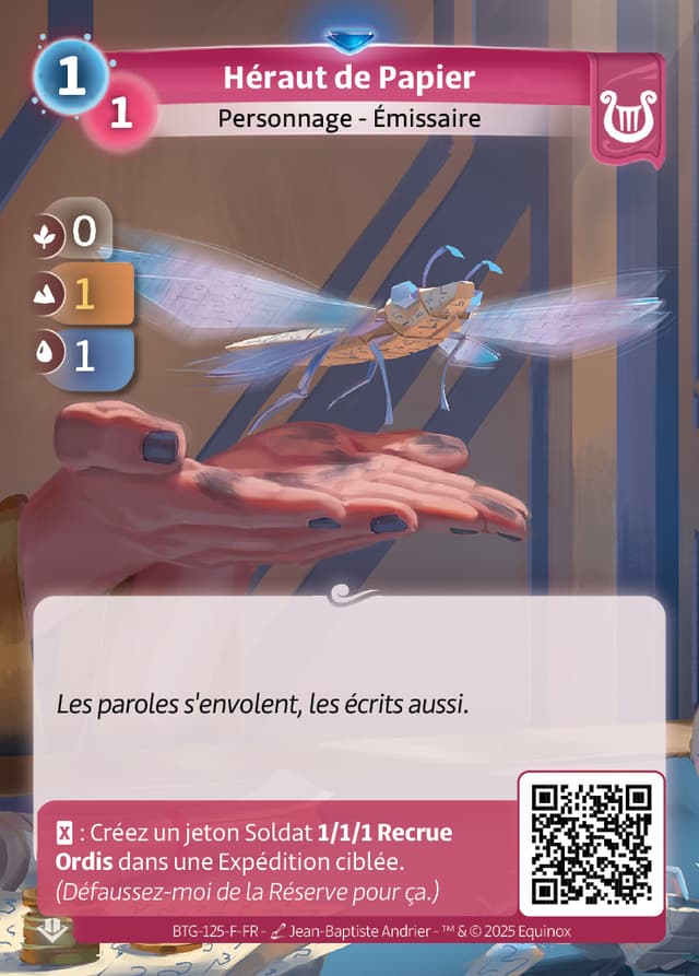 : Créez un jeton Soldat 1/1/1 Recrue Ordis dans une Expédition ciblée.(Défaussez-moi de la Réserve pour ça.)
