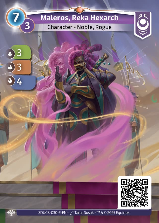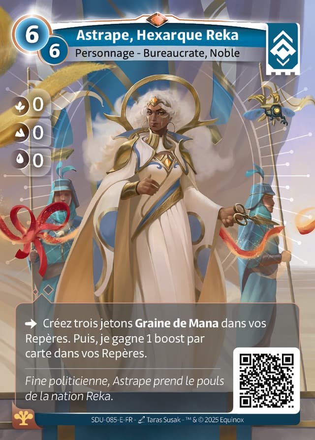 Les Hexarques sont au coeur de cette nouvelle édition, tant en termes de gameplay puisqu’il s’agit des 6 cartes exaltées, qu’au niveau de l’histoire où ils et elles sont l’enjeu de toutes les discussions politiques et négociations. Retrouvez les Hexarques dans leur illustration Émissaire : une fresque exceptionnelle de 6 cartes à juxtaposer, qui les représente dans leurs atours de cérémonie.
