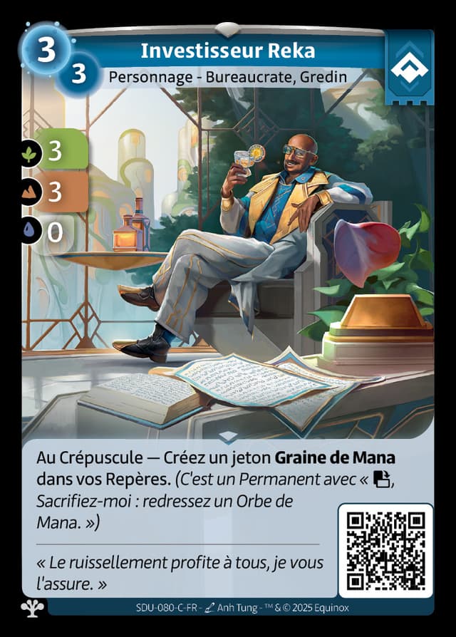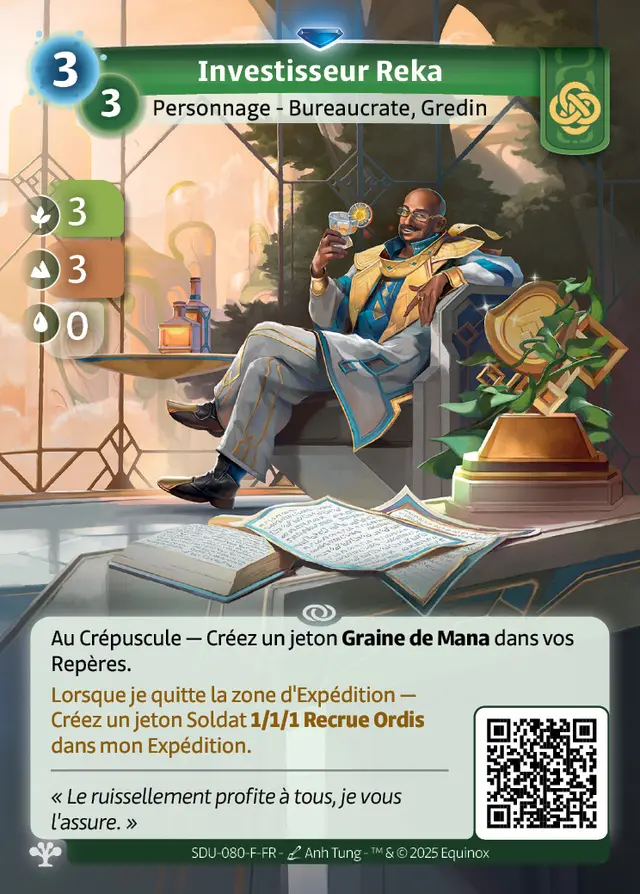 Ce nouvel axe “permanent” chez Ordis offre l’occasion de découvrir les nouveaux permanents du set comme Les Retrouvailles, cette sculpture massive qui célèbre l’alliance entre Asgarthi et Reka. Cela nous permet aussi de redécouvrir des cartes plus anciennes qui trouveront une place de choix dans les decks Matz. Parmi les précédents sets, des cartes à coût élevé comme Monolith, Bastion Ordis, ou à usage unique comme Navette des Scarabots OOF, ainsi que les Aérolithes introduits dans Skybound Odyssey, semblent être des outils particulièrement adaptés à ce nouvel archétype. Dans Seeds of Unity, des cartes comme Investisseur Reka viendront également renforcer efficacement la stratégie de ce Héros.