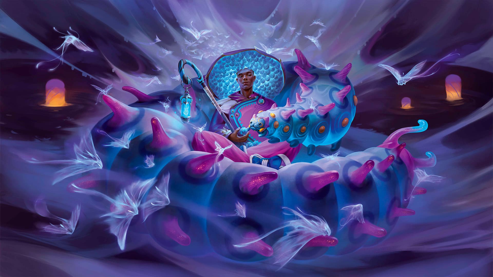 Rien ne le destinait à devenir Exalt. Exobiologiste de formation, Moyo avait pour vocation d’étudier, pour les Yzmir, les espèces inconnues découvertes au sein de la Terra Incognita, au premier rang desquelles figuraient les Chimères. C’est sous le patronage de Saskia, une naturaliste Muna, que l’entomologiste a commencé à étudier les Phalènes de Mana, une espèce à mi-chemin entre l’Éther et le réel, au point de devenir un spécialiste de cette forme de vie hybride. Lorsque le Nilam, l’arbre-monde défunt des étendues enneigées du Storhvit, s’effondra suite à la libération de Kuraokami, son écorce fut transportée comme matériau de construction d’un édifice magique, dédié à l’expérimentation occulte et à la surveillance des courants de Tumulte. Mais lorsqu’on découvrit dans son tronc cristallisé une larve gigantesque, c’est Moyo qui hérita de la lourde tâche de l’étudier et de veiller sur elle. Devenue chenille, la Chimère tissa un lien étroit avec son soigneur, au point que tous deux décidèrent de se lier à travers le Musubi.